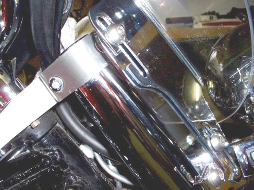 Cut the bottom slots about 1/4 inch from the bottom of the stock windshield bracket and the upper slot just about the center of the upper adjusting area. This method gives you full vertical adjustment of the windshield.